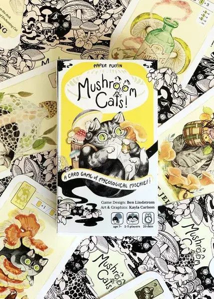 Mushroom Cats! is an adorable card game about a mushroom hunt gone awry. Players compete to gather, steal, and magically transmute the most valuable collection of mushrooms they can before the picking is done and a winner is declared.